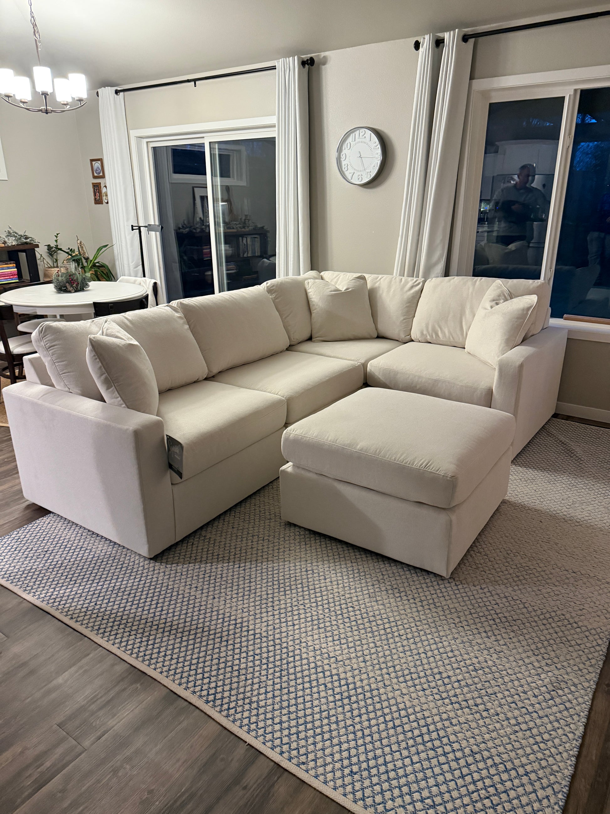 | Details | Includes 5 modular pieces: left-arm facing corner chair, 1 armless chair, 1 wedge chair, ottoman and right-arm facing corner chair, "Left-arm" and "right-arm" describe the position of the arm when you face the piece, Modular pieces can float anywhere; sides are finished (with no connectors), Corner-blocked frame; reversible seat and back cushions; high-quality foam cushions wrapped in poly fiber, Throw pillows included; soft polyfill, Polyester upholstery, Next-Gen Nuvella™ is a family-friendly fabric that is soft, easy to clean, stain-resistant and durable, Easy-to-remove zippered covers for machine washing, Clean fabric with mild soap and water, let air dry; for stubborn stains, use a solution of 4 oz. bleach to 28 oz. water, Non-skid legs, Platform foundation system resists sagging 3x better than spring system after 20,000 testing cycles by providing more even support, Smooth platform foundation maintains tight, wrinkle-free look without dips or sags that can occur over time with sinuous spring foundations | |